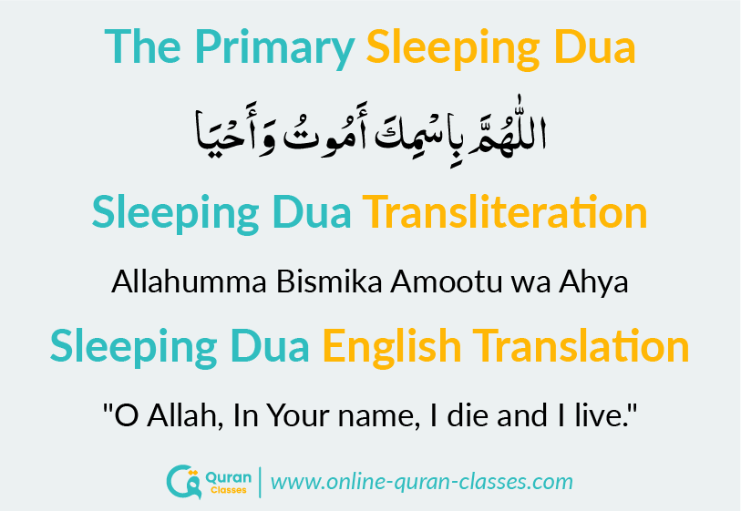 The most fundamental sleeping dua is “Bismika Allahumma amootu wa ahya” (In Your name, O Allah, I die and I live). This dua acknowledges Allah’s control over life and death and is recommended as the minimum supplication before sleep.